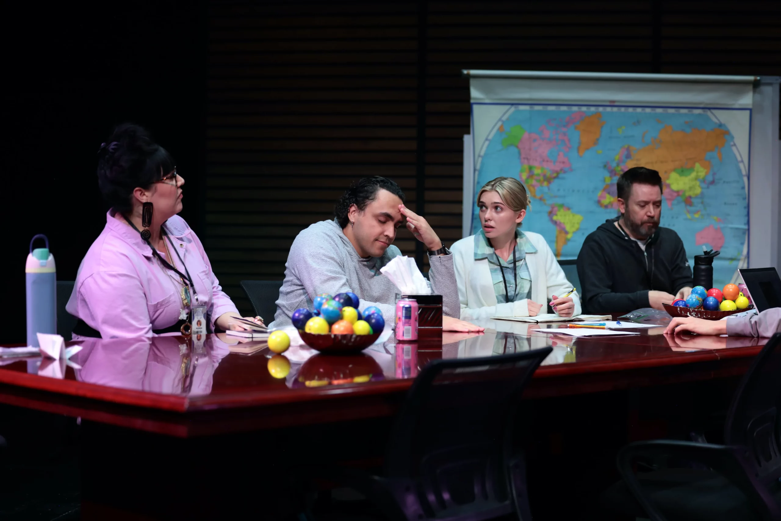 In director Jack Cobabe’s production of Baker’s 2017 script, eight people sit around a table in a dull conference room, spitballing ideas for the next great story. A monstrous tower of LaCroix cases looms upstage; a water cooler and a fake plant sit idly in a corner. Sandy (Matthew Ivan Bennett) is the chairman of the brainstorming session, whose nonchalant charisma conceals a nagging undercurrent of misogyny and manipulation.