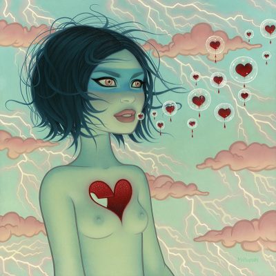 More recently, McPherson has been further exploring astronomical ideas through aurora borealis and quantum energy through her paintings. “I’ve been really fascinated with things coming out of the characters’ eyes, so I’m playing around with that imagery, and this other take on the visual and what can actually be emitted from our eyes, kind of like a star emits light,” she says.