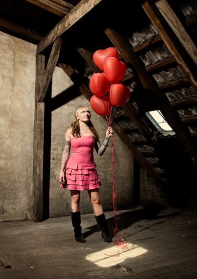 While inspired by her background in astronomy, McPherson’s work also contains emotive qualities that range from her whimsical “Mr. Wiggles”—a black balloon with big, bulging eyes, to the idea of personal strength through hardship, represented by her trademark heart-shaped cutouts in the torsos of her subjects. “Originally, I came up with the idea of that when I was going through a devastating breakup,” she says.