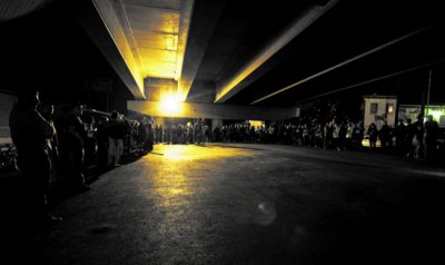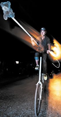 A large crowd gathers under an inconsequential highway overpass on a clear Friday night. Graffiti-sprayed railroad cars and rusting chain-link fences backdrop an unlikely scene. Cody Barnhill looks across the dimly lit asphalt at his opponent. Supported by a friend, he balances about four feet above the ground on the saddle of his tall bike. Under his arm is a ten-foot-long pvc pipe with the head of a stuffed, toy teddy bear impaled on the end. As stage smoke curls around the tall bike’s wheels, acoustic punk band Bombs and Beating Hearts begins another angry ballad. The crowd of over a hundred spectators begins to cheer in anticipation. “I’m fucking amped,” says Barnhill.