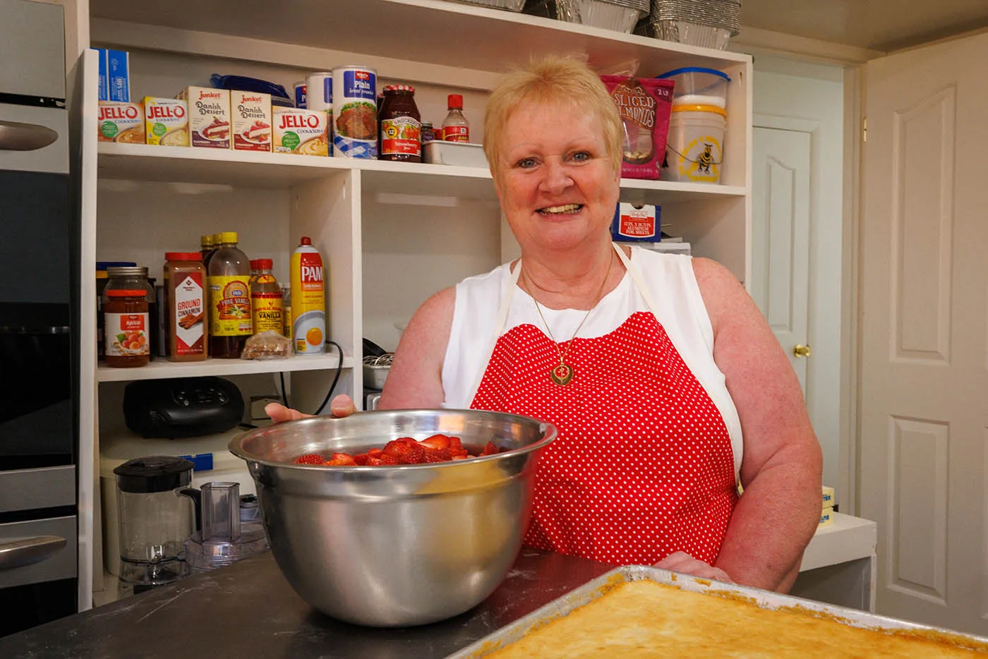 Lately, her favorite sweet dish to bake is her wide assortment of flavored cheesecakes, which vary by season. “I love flavored cheesecakes,” she says. “I have mandarin orange, blueberry, lemon, chocolate, raspberry, strawberry and, for the fall season,