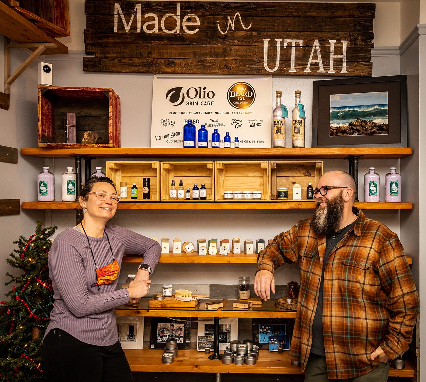 For nearly eight years, Derek and Jennifer Williamson have been using natural, organic and predominantly vegan processes to create their Olio Skin and Beard Co. products. “We’re mindful of what we’re making and how we’re making it,” Derek says. As Co-founders of Olio, they provide Salt Lake City residents and visitors with beard oil, face and body oil and salt scrubs. Their modest beginnings at a booth at the Wheeler Sunday Market have evolved into a Sugar House studio housing a greatly expanded self-care product line, including products for skin, tattoos, babies, beard and hair as well as soaps.