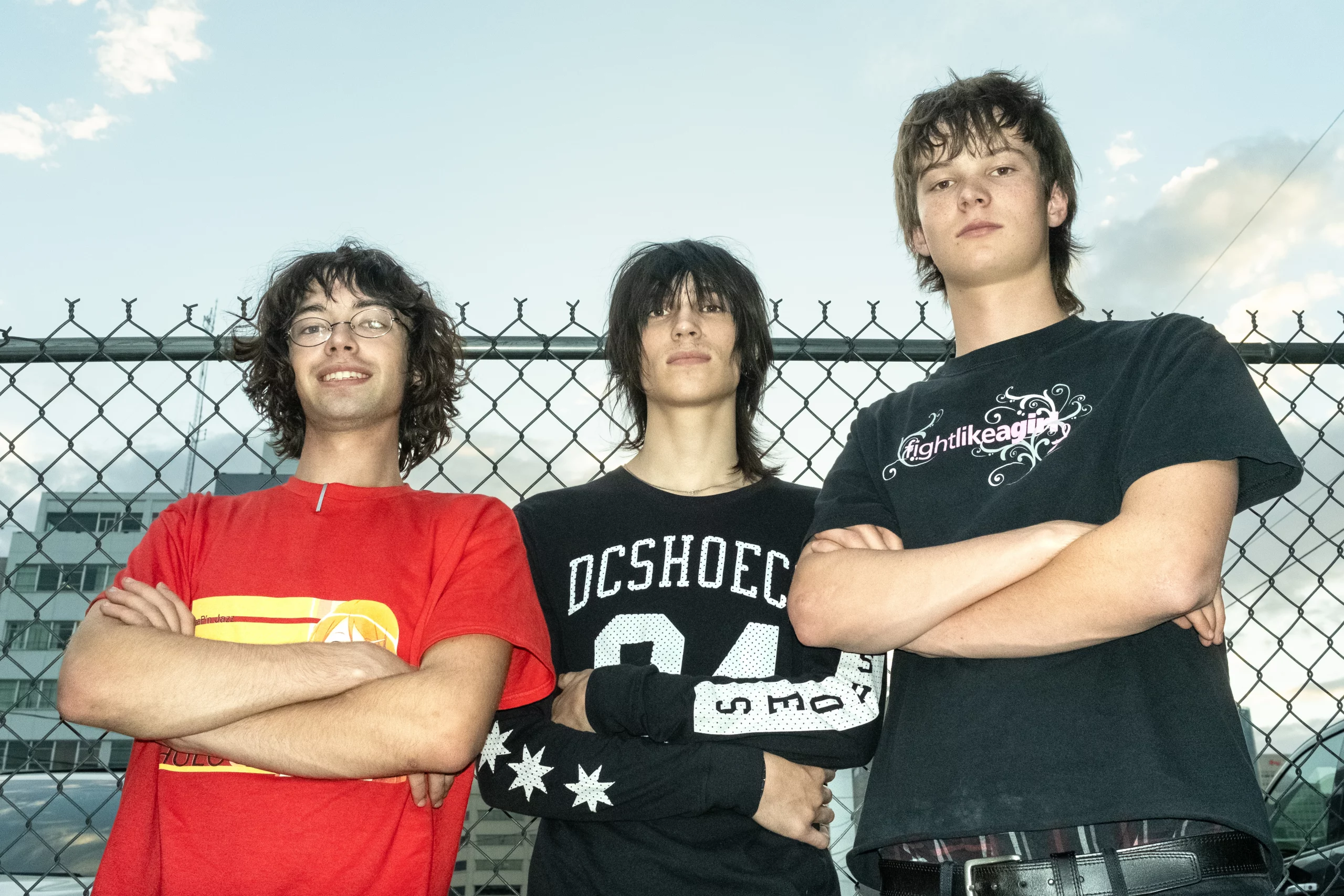 The members of eardrums stand in front of a chain-link fence.
