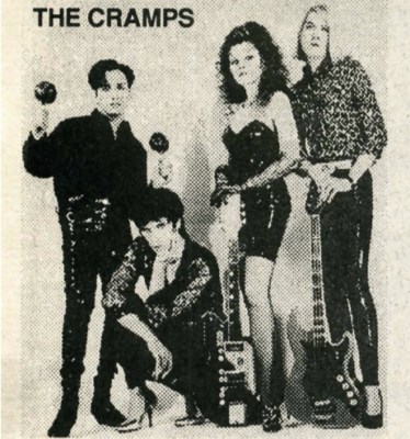 The Cramps were just beginning their set as the gatekeepers apologized for the slight, allowing me into the club. Lux Interior looked giant in his heels and black polyurethane suit. Poison Ivy was resplendent with her cascade of red hair and the skin-tight black bodysuit which gave only hints to the voluptuous wonders pictured on every Cramps album—they were hidden by her large (of course) Gretsch hollow body. No strats or teles for this girl. Off to the side was Slim Chance on the bass, also in heels and black, and looking mighty pretty in makeup.