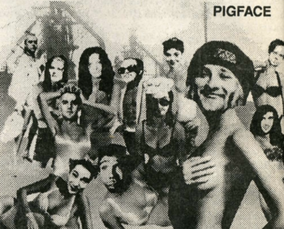 The plan was to catch some Pigface then go back to the Zephyr for Pop Will Eat Itself. Things didn’t work out that way. From the opening moments of Pigface’s show I was transfixed. The band played behind a screen while a Mad Hatter sang. One song and the screen came down to reveal a double drum set, a huge black man on the bass, a pony-tailed keyboardist, two guitarists and the Hatter. Pigface had a huge, hearing-damaging sound.