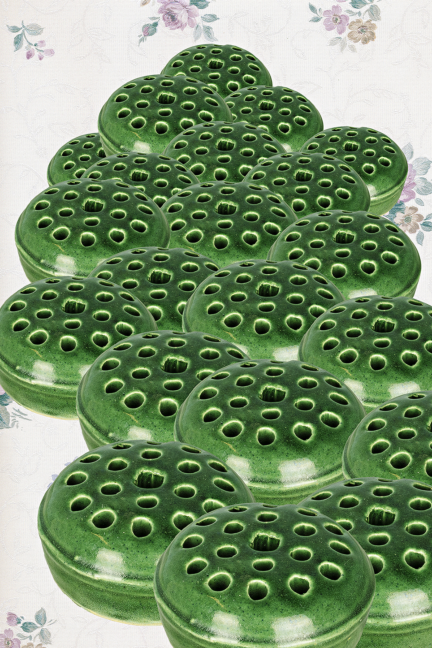 In “1a,” Duque stands wearing an orange vintage floral dress, with the back of her hand delicately draped over her face, palm facing the camera as she holds a shovel with a decorated handle with the other arm. In this image, I can almost feel the temperature of the prop garden in a 1960s spring, leaving me curious about what garden my own grandmother was tending at that time.