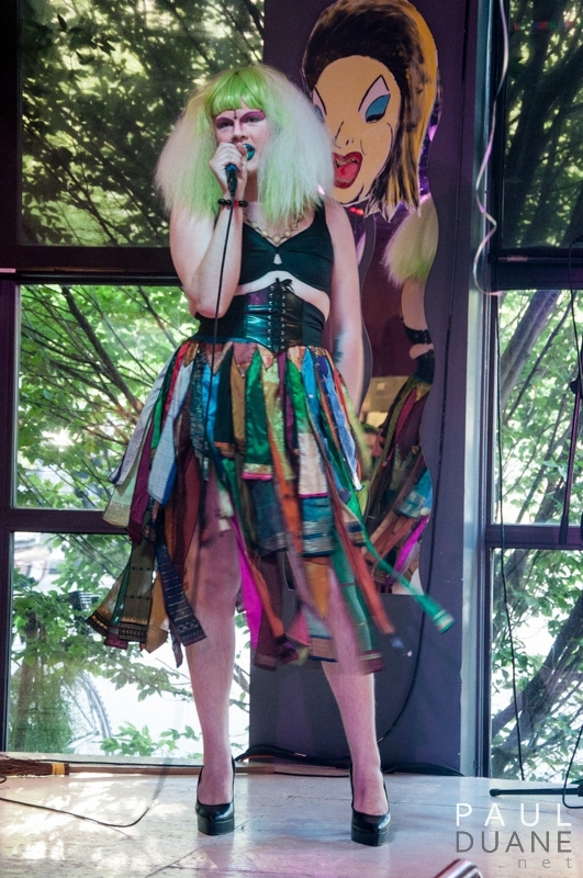 Two of the organizing members of the Bad Kids, Klaus and Cartel, performed at 1 a.m., to ensure that everyone could see both Miss City Weekly and themselves. Klaus was a demon on stage, exorcised by a campy Mormon missionary. Cartel, looking like a deranged Bozo the Clown in fetish clothes, performed to that summer anthem, Icona Pop’s “I Love It,” and the post-punk classic “Warm Leatherette,” (the Peter Murphy and Trent Reznor cover), all while wheeling around a gimp in a wheelchair.