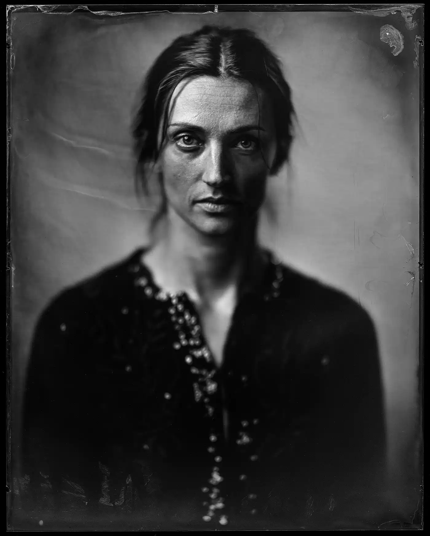 Briggs believes this process changes the dynamic of having your picture taken and compares it to sitting for a figure drawing class. “It kind of disarms people and unmasks them,” he says. With tintypes, people can’t go to their typical selfie angles and poses for those candid moments. Unlike traditional shoots where 100 images can be shot in 30 minutes and then combed through to pick the best ones, Briggs’ subjects have to come in knowing what they want and how they’re going to achieve it in only one or two shots. The tintype camera has a narrow plane of focus and takes a long time to shoot, forcing Briggs to be creative about posing his subjects. Moving even an eighth of an inch can completely change the image’s focus. “My process is kind of a paradox—how do you get people comfortable and natural while [they are] in an extremely intimidating and difficult environment?” Briggs says. He believes that being able to read people and get their input regarding poses and other visual elements helps to develop images that tell a story, represent someone’s identity, or portray a character.