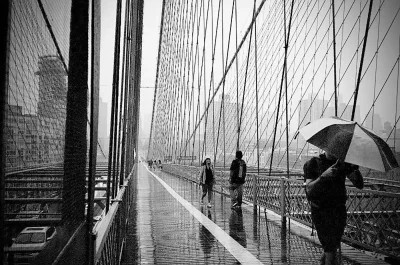 Oftentimes, Guzman’s photos do have stories behind them, making the images even more intriguing. One of Guzman’s own favorite photos features two people meeting on the Brooklyn Bridge while a third person carrying an umbrella walks just beyond them. A stunning photograph on its own, Guzman’s experience of capturing the photo while huddled under scaffolding to avoid the rain makes it even more breathtaking. “I noticed this dude who was just super smiley,” Guzman says. “I was like, ‘What’s going on with this guy? Is he drunk?’ And then I realized he was meeting someone on the bridge, and in that photo, you can see him meeting up with a woman. As they’re walking, there’s a [man] in front of them with an umbrella … just minding his own business.” Guzman was able to encase three peoples’ different experiences in one minute, intensified by his patience and determination to capture that exact moment through film.