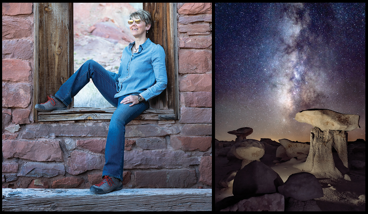 In a Toyota 4Runner crammed with camera gear and multiple dogs, Kenyon seeks her next photograph with a mixture of spontaneity and meticulous planning. “My personality is: ‘Let’s just hit the road!’” she says, “but also, I have a destination in mind.” One example of Kenyon’s intensive preparation features her dog Tuffy sitting below Metate Arch in Grand Staircase–Escalante National Monument as the Milky Way looms above. “It’s a blend, meaning several photos were taken at separate times, forming a single composition.” Kenyon used an app called PhotoPills to determine the perfect moment of alignment between the arch and the Milky Way. Then she spent several months editing the shot to achieve a precise final result.