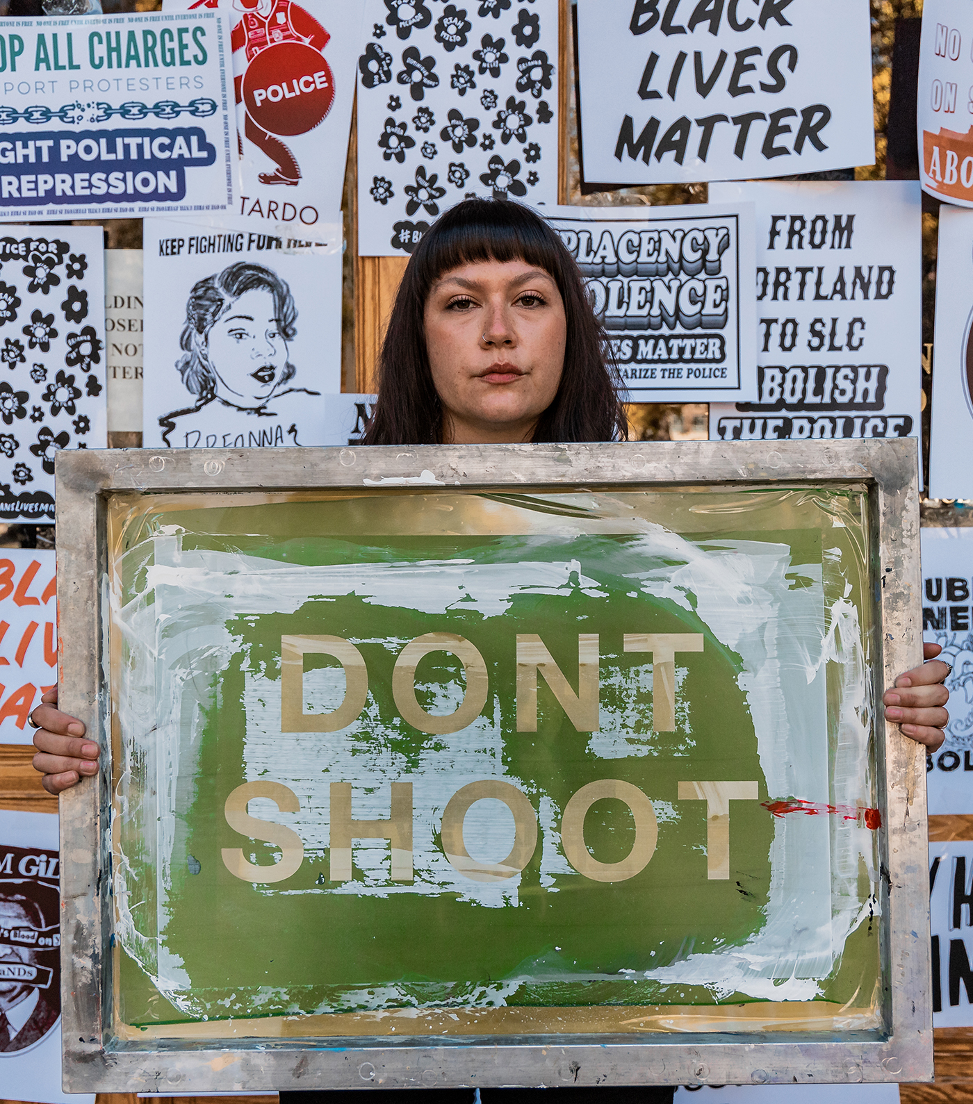 On May 12 of this year, local artist Taylar Jackson began learning how to screen-print. By the time of the first large-scale protests following the murders of Bernardo Palacios (on May 23) and George Floyd (on May 25), she was already mass printing signs for the movement adorned with the oft-chanted phrases “DON’T SHOOT” and “NO JUSTICE, NO PEACE.” Since then, her screen-printing operation has evolved into Local Propagandists, a revolutionary-minded team of artists and printers that, in her words, make “art for the murdered and the missing.” With an ever-fluctuating cast of collaborators and volunteers (over 100 were involved over the summer), Local Propagandists currently exists as a core four-person team, with Amoiri DeBusk, Hannah Kim and Tressa Marre joining Jackson as full-time designers and printers.