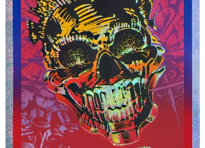I felt different and wanted something new. First, I drew an image of a smiling skull—“Day of The Dead” style—then, added a New York fedora hat and fur-collared trench coats like in the movies Shaft and Superfly, and I crossed his fingers for “good luck.”