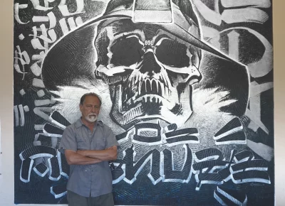 I had seen Mexican political party signage on street walls visiting my grandparents in Tijuana [that were] made with a stencil. That gave me the idea to use a stencil for my own tagging; faster and more tags per night was my thinking. Tagging my 5-foot-high skull stencil was so cool and used very modern materials for those times, a large sheet of Milar plastic.