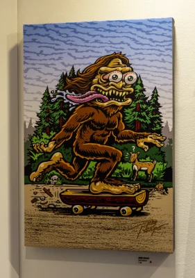 That iconic style didn’t end with Phillips himself. His son, Jimbo Phillips, has carried forward the distinct, bold and chaotic flair into a new generation of skate graphics. Among the works showcased in “Common Shred” is “Skatesquatch,” a skating Sasquatch print on canvas by Jimbo that feels right at home among the show’s mix, a fitting nod to the weird, rebellious aesthetic that shaped both the Phillips name and skateboarding itself — art that Harrington continues to admire.