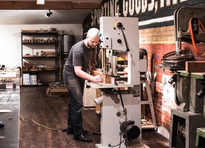 Reo bought the business from his father about two years ago—Ken refused to sell to anyone else. “These buildings are lifelong projects,” says Reo. “I’ve been working on this building since I was 8 years old. I love this building.” The main focus of the shop is the same, and after Reo remodeled the space, he saw a spike in business. Unfortunately, Ken passed before Reo began the remodel, but Jan from Bee Hardware “stopped in [the shop] a couple weeks ago,” says Reo. “He got teary-eyed, seeing what this place has turned into.” Jan was so excited that he started telling old stories, like how “the town sheriff was standing here drunk, and his gun fired and almost shot his foot off.” Reo pulls back the rug, exposing a rugged bullet hole in the dark, antiqued hardwood floor.