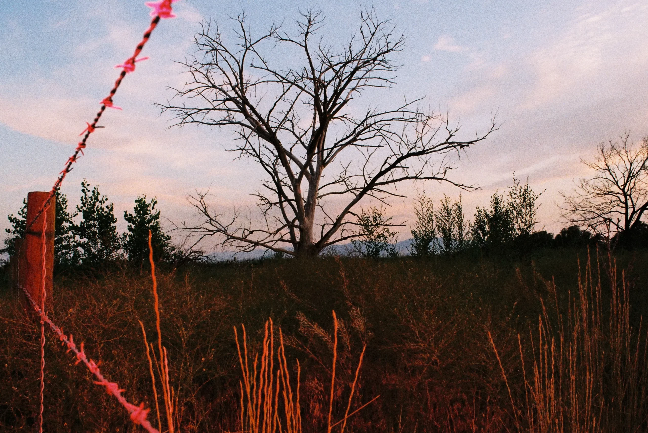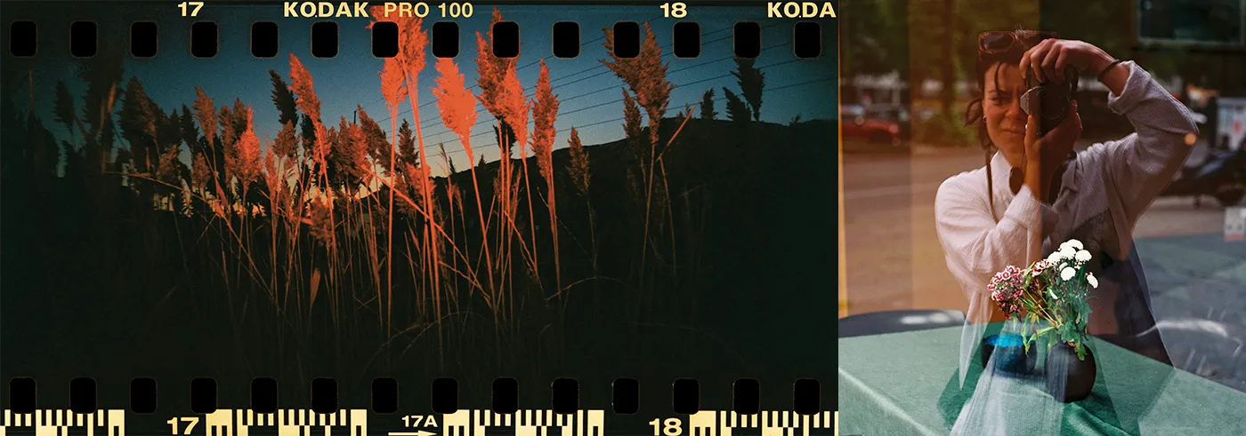 Left: “Red Grasses at Night,” 35mm, 2025. From the Flora series. Right: Portrait of Jillian Meyer.