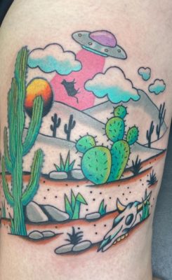 Rainbow horses, barns, cows, churches with stained glass and of course, cowgirls, all harken to a Wild West revival that has emerged over the past few years in pop culture. Friend draws from memories in her past and breathes new life into them with a contemporary mindset. Because of this, Friend found herself tattooing many members of the SLC queer community. She managed to combine two juxtaposing themes for many who grew up struggling to love who they are and where they came from, allowing them to reclaim their own complex histories.