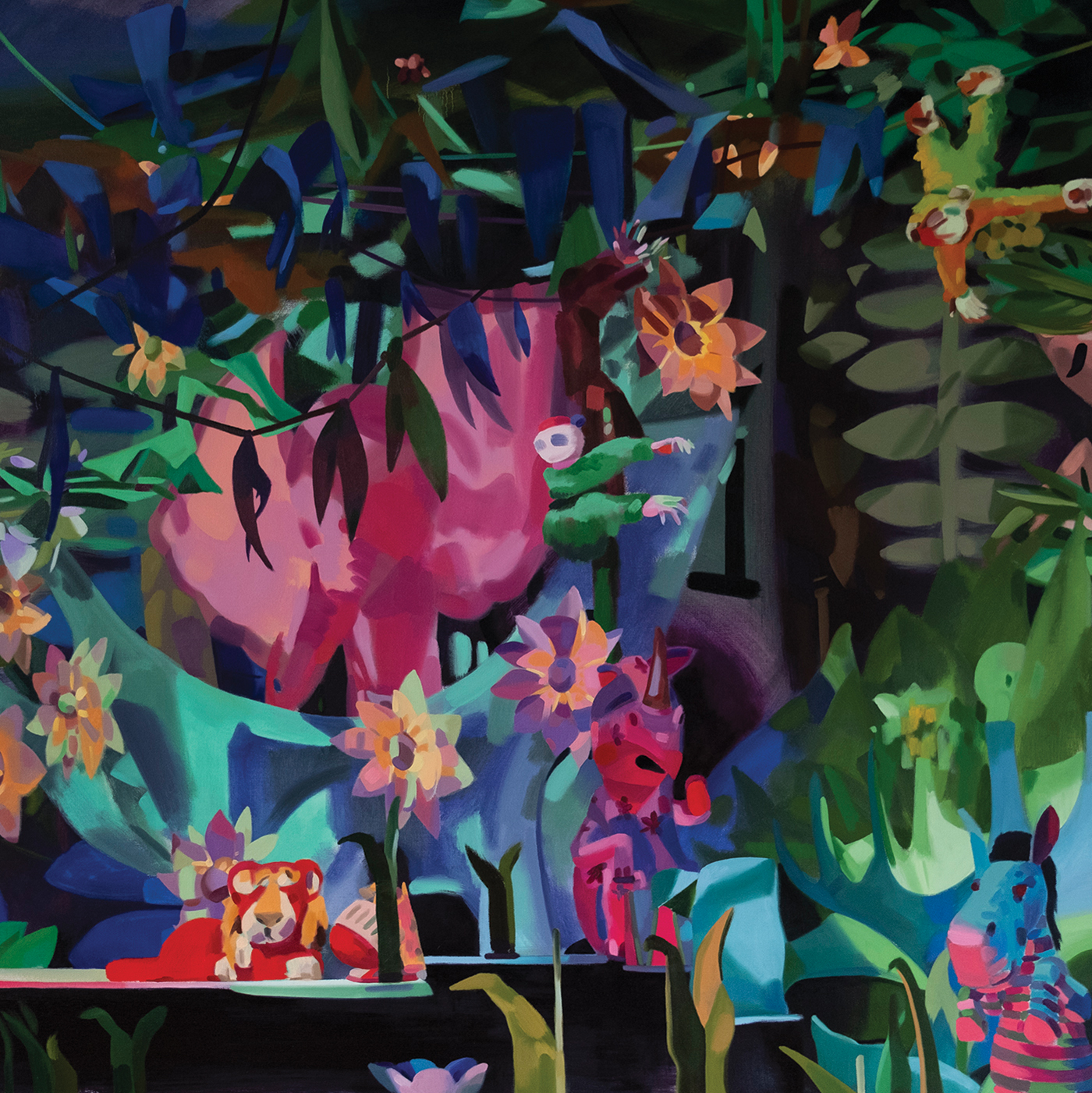 At 48 by 60 inches, “Mattek-Sands” is among the collection’s larger works. The painting features iconic tennis athletes James Murray and Bethany Mattek Sands smiling victoriously with a shining trophy in hand. The image feels immediately familiar: It’s celebrated champions backed by waving American flags. A theme of Miscellaneous Debris is the simultaneous attraction and repulsion that Wagstaff feels with certain images. In “Mattek-Sands,” our collective desire for reverence and celebrity status is in the balance, but so is the uncomfortable examination of how we define winning in our culture. Also in the category of sporting subject matter, the painting “North Korea: World Cup Champions” is based on “a weird Youtube video of a North Korean news anchor showing highlights of the North Korean soccer team winning the world cup.” Given the volume of information available, Wagstaff says, “You can find whatever ‘facts’ you want. That puts us squarely in a ‘Post Truth’ situation.” Another painting, “Aftermath 2,” depicts scattered aftermath of a disaster and explores the process of how traumatic events and loss eventually transition into an unfamiliar equilibrium.