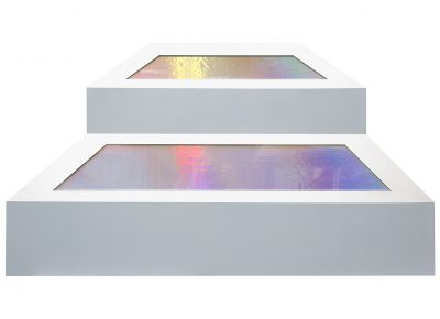 While Andrew Alba’s Everyone Sucios (the other of the two shows featured at Finch Lane through July) takes a confrontational, in-your-face approach to processing the harsh realities of the world, Hendricks leads viewers into a world that, at first glance, looks real but is ultimately an escape fantasy. “SIX MONTH SUMMER No. 2” shows two expertly color-balanced rectangular blocks with opalescent surfaces that gleam like pools of water or pieces of metal. The two-point perspective of these abstracted architectural elements lends the illusion of three-dimensionality, playing with how our minds perceive volume and distance to create a fantasy object in space. “The balance between fantasy and reality is achieved through familiarity,” says Hendricks. “Although I collage my photography, which can make the imagery feel surreal, there are elements that are still recognizable. I like to say my work is ‘based on a true story.'”