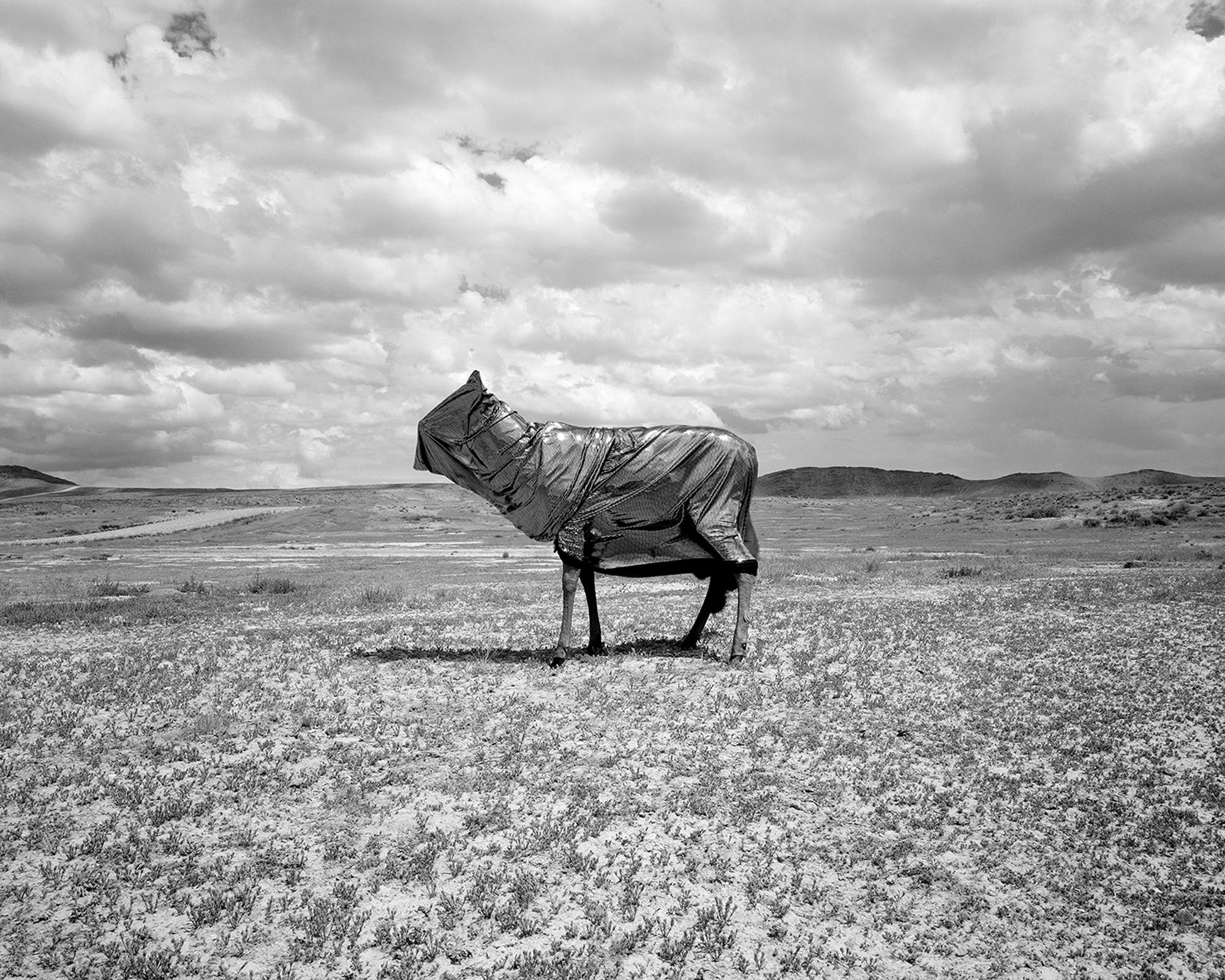 Gritty, dark and suffused with a subtle, surreal humor, Levi Jackson’s photographs play on the illusions operating in the Western American landscape and culture. From a black-and-white image of the ground stamped with the phrase “My Name Is Mud” (Untitled, 2014) to a series of photos featuring livestock decoys and other objects wrapped in fabric (including Ms. September, 2014 and Hey, Pilgrim, 2019), Jackson isn’t shy to intrigue viewers with simple but perplexing combinations of objects and media. “What I am trying to do is create something that isn’t harmonious … but which still tricks you into thinking it’s true,” Jackson says. “This is the ideological foundation of the West … and of photography.”
