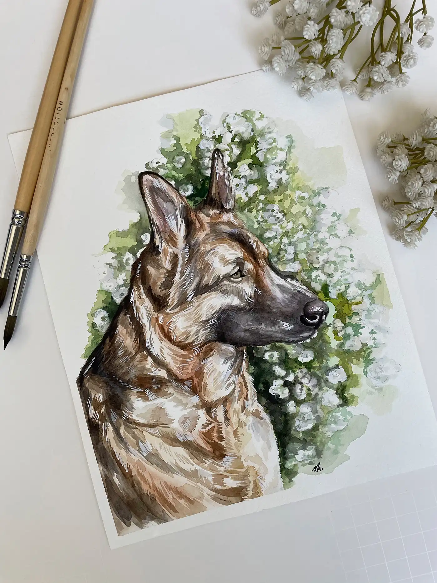 Hubbard’s first pet portrait was of a friend’s dog, an Oreo-colored Border Collie named Dexter. “One day, he sat right in front of me and turned around with the cutest little look on his face. I took a picture of it and told my husband, ‘This would be a really cute pet portrait,’” she says. “I didn’t tell [the friend] about it. I gifted the watercolor portrait to him later. He was so excited that he almost wanted to cry when I gave it to him. He was like, ‘Oh my gosh, this is my dog!’ It was such a nice feeling.”