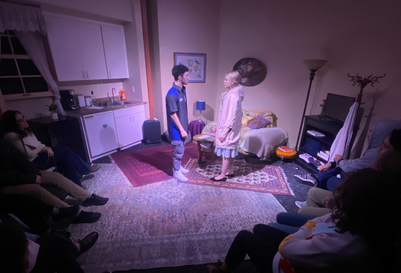 The intimate placement of the audience section, located in a kitchen of the building, heightened any anticipation and discomfort I already had walking in. The minimalist, claustrophobic set is reminiscent of a living situation a lot of us arts enthusiasts probably had sometime during college, transporting the audience to a one-room apartment under somber, blue light.