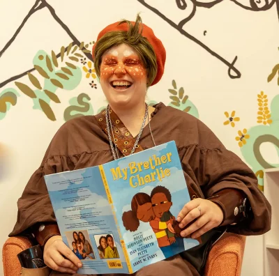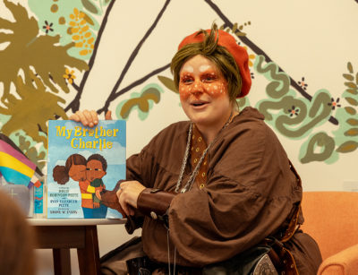 For their reading, Oddity chose My Brother Charlie by Holly Robinson Peete and Ryan Elizabeth Peete, illustrated by Shame Evans. April being Austistic Appreciation/Acceptance month, the book felt a perfect fit. “The book is a very moving story about a family coming together to love and appreciate Charlie just the way he is,” they explain, “something queer children can also relate to.” Oddity ended their reading with a lip sync to the queer anthem This is Me, a song from The Greatest Showman sang by Keala Settle. Clapping and humming along with my fellow audience, I felt the upbeat tune was a spirited close to Drag King Story Hour.