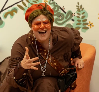 Autumn The Oddity took the floor next, dressed in medieval fairycore garb—complete with a Viking horn goblet—white freckles and a red mushroom beret (that I desperately need for myself). Their whimsical aesthetic seemed to fit perfectly in this place, where fairy tales and adventures are only a book cover away. “As a drag changeling, I am transforming all the time,” Oddity explains. “One day I might be a frightful demon, the next a hyper-masculine, Viking barbarian—and after that? A childlike lost boy right out of Peter Pan.” Though you might never know what to expect from the spritely creature, a performance from Oddity always promises that “shit is about to get weird.”