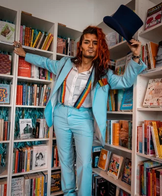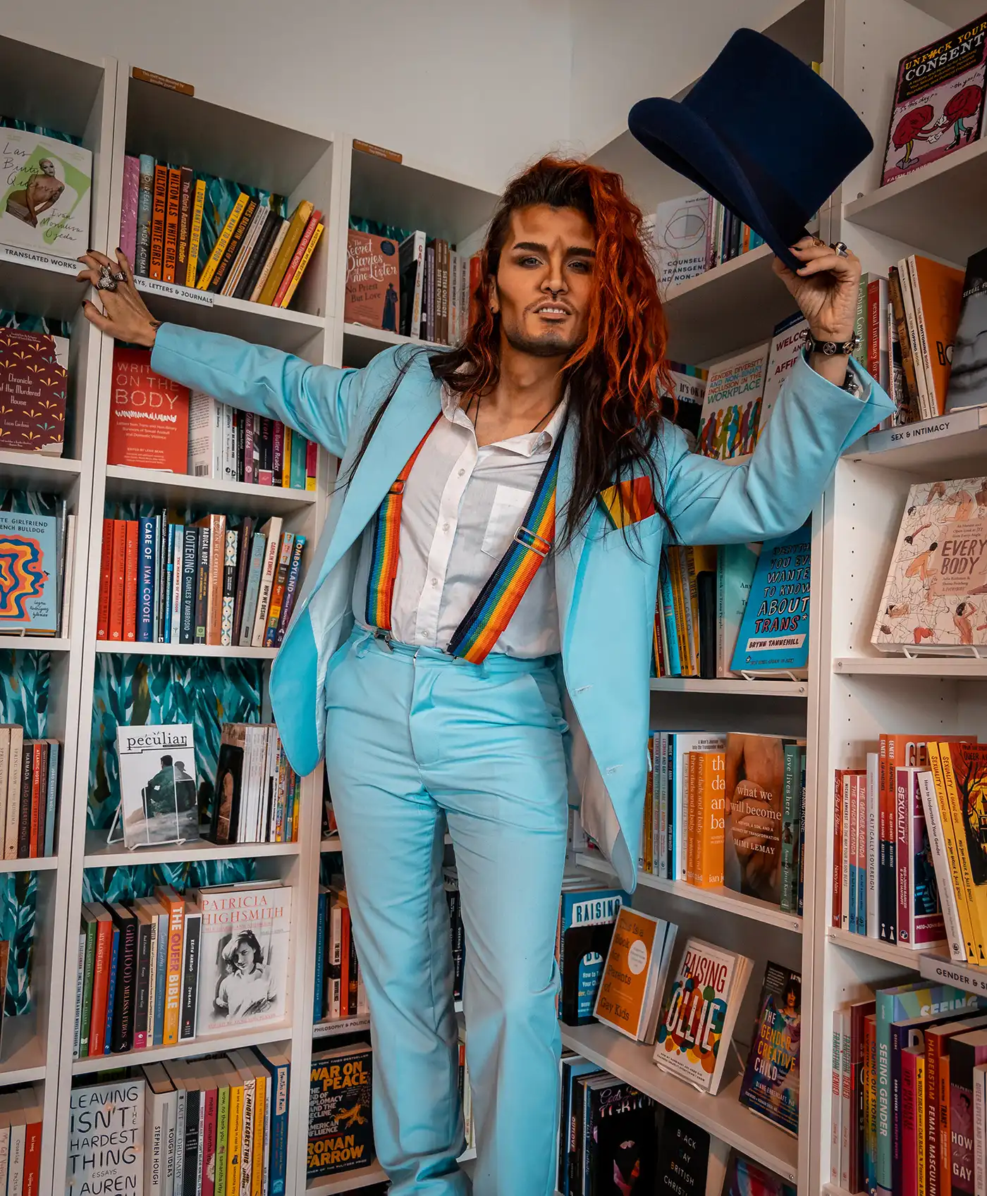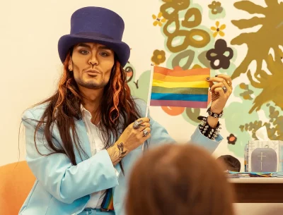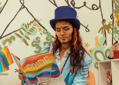 Donning a powder blue suit, rainbow suspenders and a plum-hued top hat, Kory Edgewood energized the room by performing a lip-sync to It’s Alright by Curtis Mayfield & The Impressions. While the certified bad boy softened his look for the event, his signature long orange locks and chiseled contour definitely served rock and roll fantasy. “Don’t be fooled by his bad boy style,” Edgewood assures. “He’s all heart.” Once the performance ended, he settled down to read the children’s book Pride: The Story of Harvey Milk and the Rainbow Flag by Rob Sanders and illustrated by Stevens Salerno. “I wanted to choose a book that helps give background on how the Pride movement started,” Edgewood says. “Harvey Milk is a name all queer youth should learn about.”