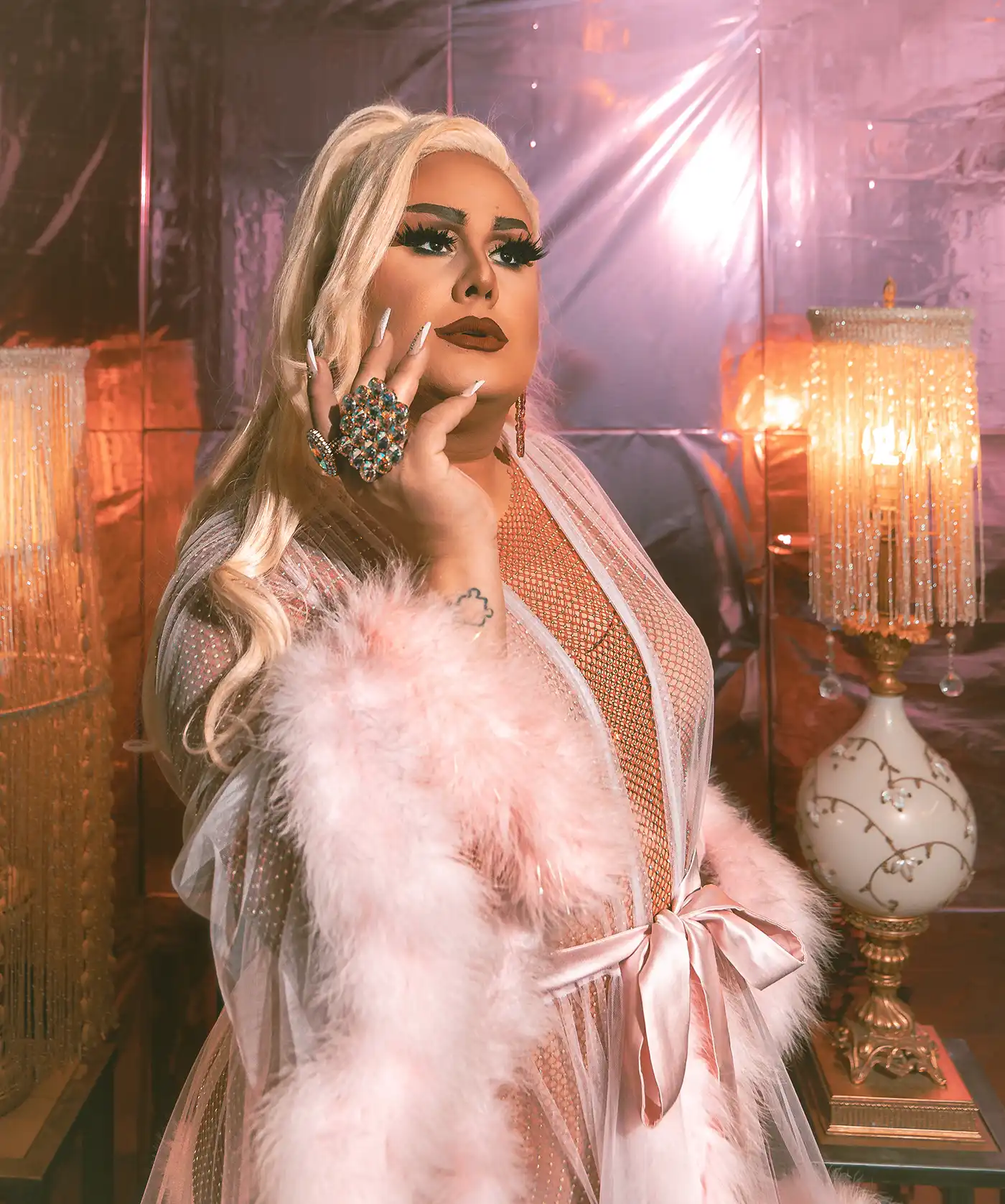 Monroig already studied fashion and modeling and knew how to do hair and makeup. From there, Monroig’s pursuit and interest in drag grew “like a little snowball you throw down a hill—it kept growing, growing and growing.” Soon she performed in clubs every Saturday, sometimes taking the 5 a.m. bus home. She says she was determined to go to a drag club, see other drag queens and be in the drag world and seen in the drag community.
