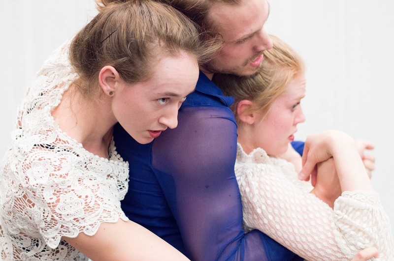 The first piece, choreographed by Sara Parker, entitled “Better an ignis fatuus/Than no illume at all,” was visually reminiscent of a mixture of The Craft and The Virgin Suicides. Candles adorned the stage and sides of the performance space on the floor. Dancers Caroline Eskew, Sarah Stott and Parker engaged in movement with each other that brought witchcraft and ritual to mind (in large part because of the candles), but it was tempered by Parker’s costuming: They wore light-colored jumpers that recalled pajamas. It’s a synergistic dance, and their violent cavorting gave the piece some nice edge. More than anything, it’s a pretty dance—it’s not transgressive or groundbreaking, but it doesn’t need to be. I found it fitting that Katherine Adler was the lighting tech, because “Better an ignis fatuus/Than no illume at all” reminded me of some of her dance-making.
