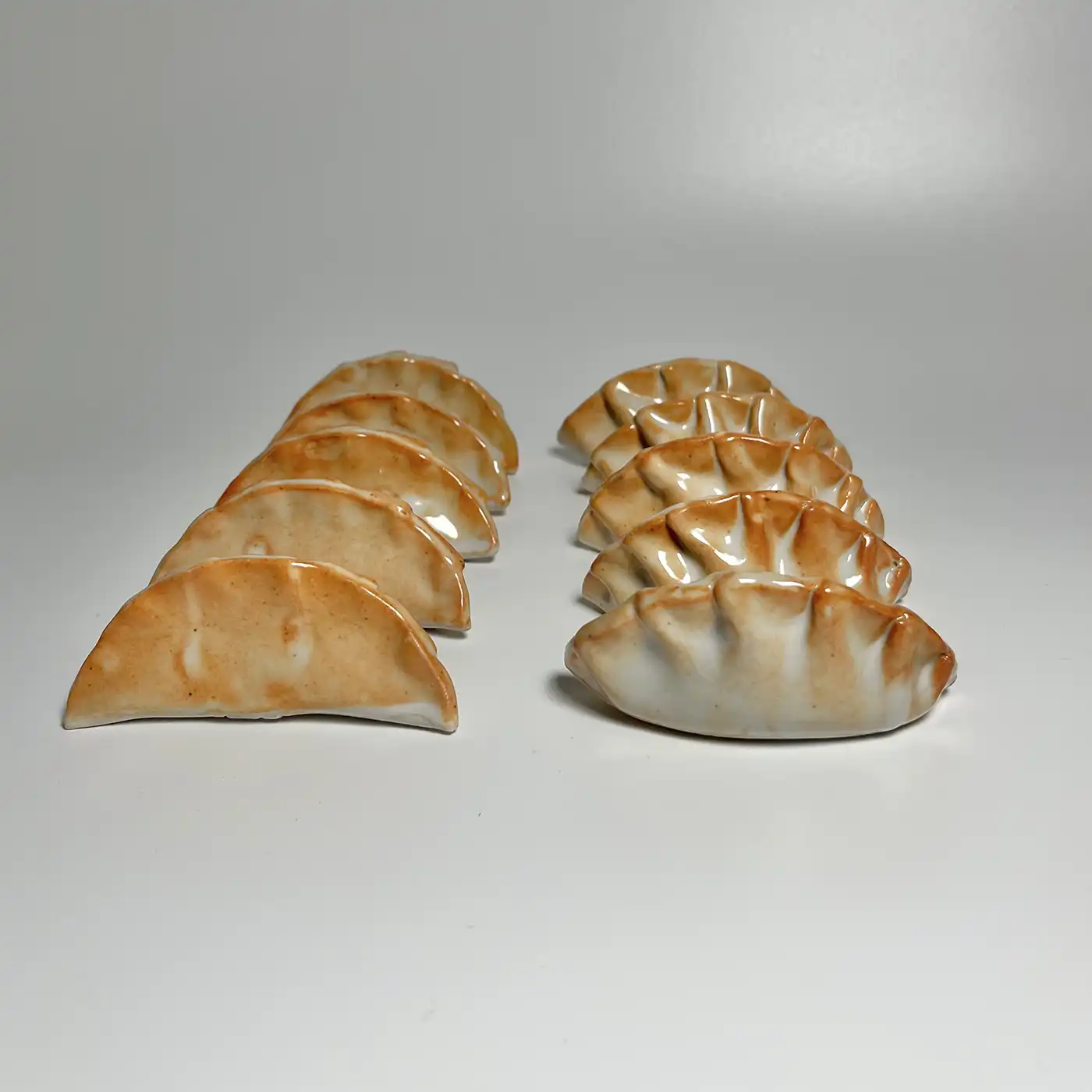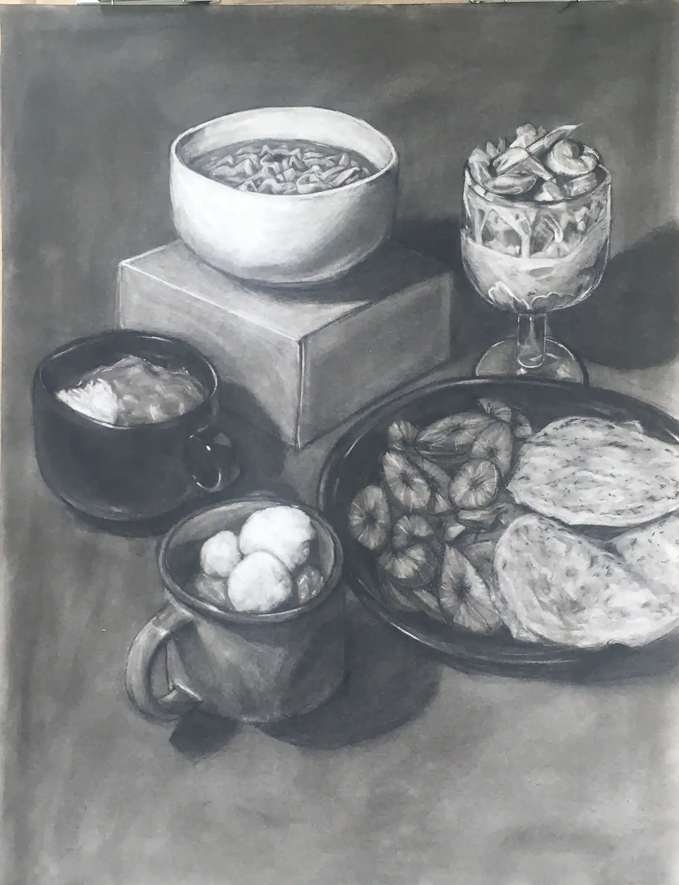 Rojas was eager to share pieces chosen for the juried show that depict food in some way. Charcoal drawing Food as a Love Language by Anisa Al-Nasser and Dumplings, a glazed porcelain display by Shiya Zeng are two pieces featuring food. Culturally significant food, ranging from tortillas to fortune cookies, are present throughout the show despite not being part of Rojas’ call for submissions. “I think it points to how much food plays a role in how we think about belonging in our homes, in our culture, with our friends,” Rojas says.
