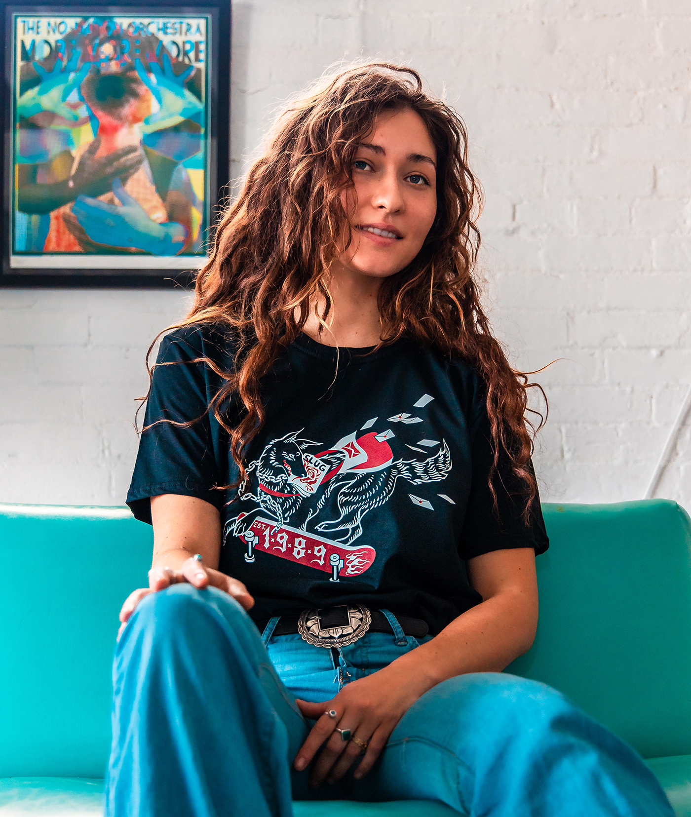 The inspiration for the t-shirt came from years of being a dog walker and her perception of SLUG’s persona. “I was a dog walker for two years, so like, running dogs and wolves are kind of burned into my mind. I just wanted to put a dog in there because I love dogs and I’ve been learning how to skateboard, so I wanted to put a skateboard in there,” says Bruno. “And I just wanted it to be something that kind of represented how I view SLUG, which is kind of independent and slightly chaotic and a little subversive. So, like the dog stealing the postman’s bag, just skateboarding away with the new SLUG Mag, like something just kind of silly but honors myself and how I view SLUG.”