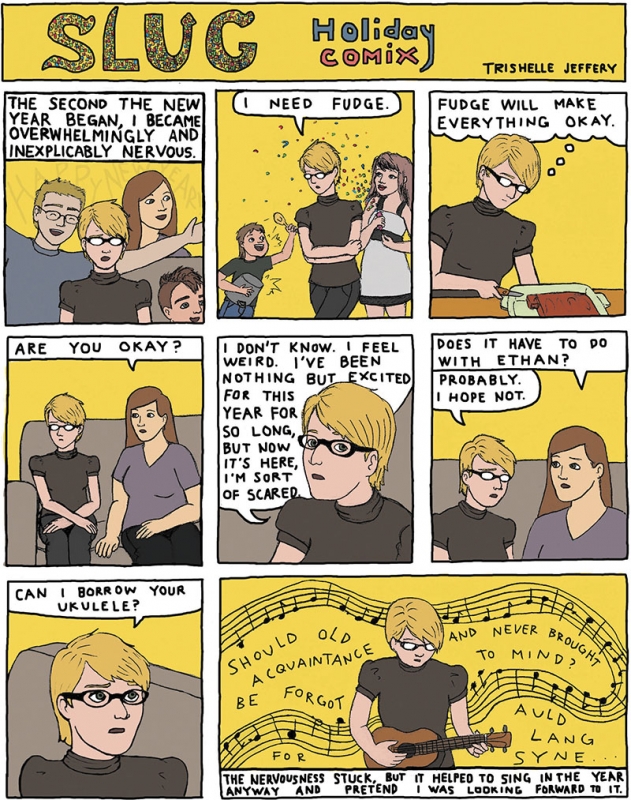 The comic medium comes naturally to Jeffery, who says, “I’ve been drawing comics as long as I’ve been drawing anything.” Whether multi-panel stories or single-frame snapshots, Jeffery’s pieces capture an insightful, memory-like stream of consciousness. “As I grew as an artist and started to figure out what I wanted to do, I realized that the things that mattered most to me and were most successful as art pieces were the things that were really personal and autobiographical.” She says, “Comic, as a format, is a good way of doing autobiography.” Making work that is completely transparent has been a rewarding process that reinforces Jeffery’s desire to be in communion with others who may relate to her art.