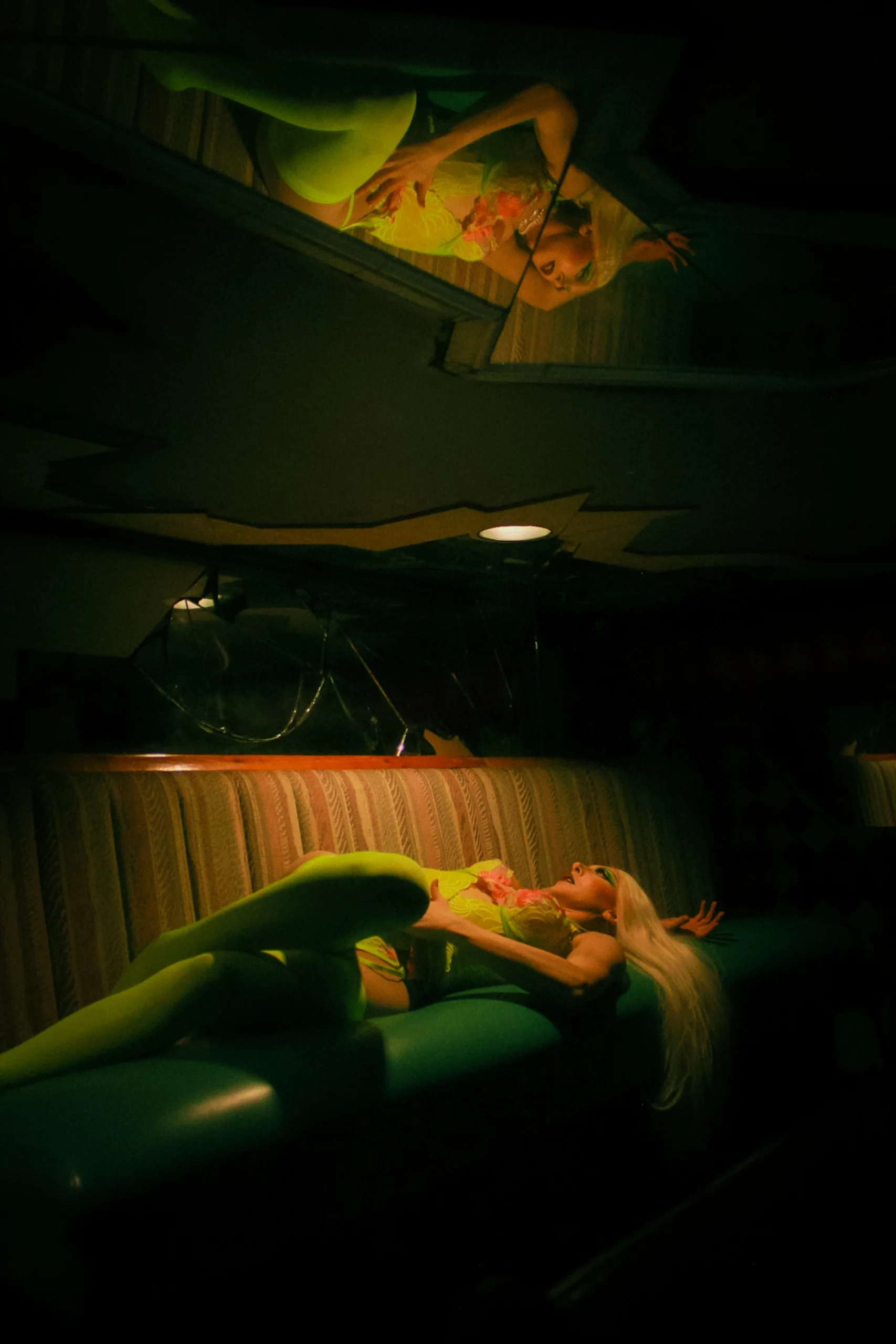 Poison Grace posing with her legs in the air in a lime-green outfit