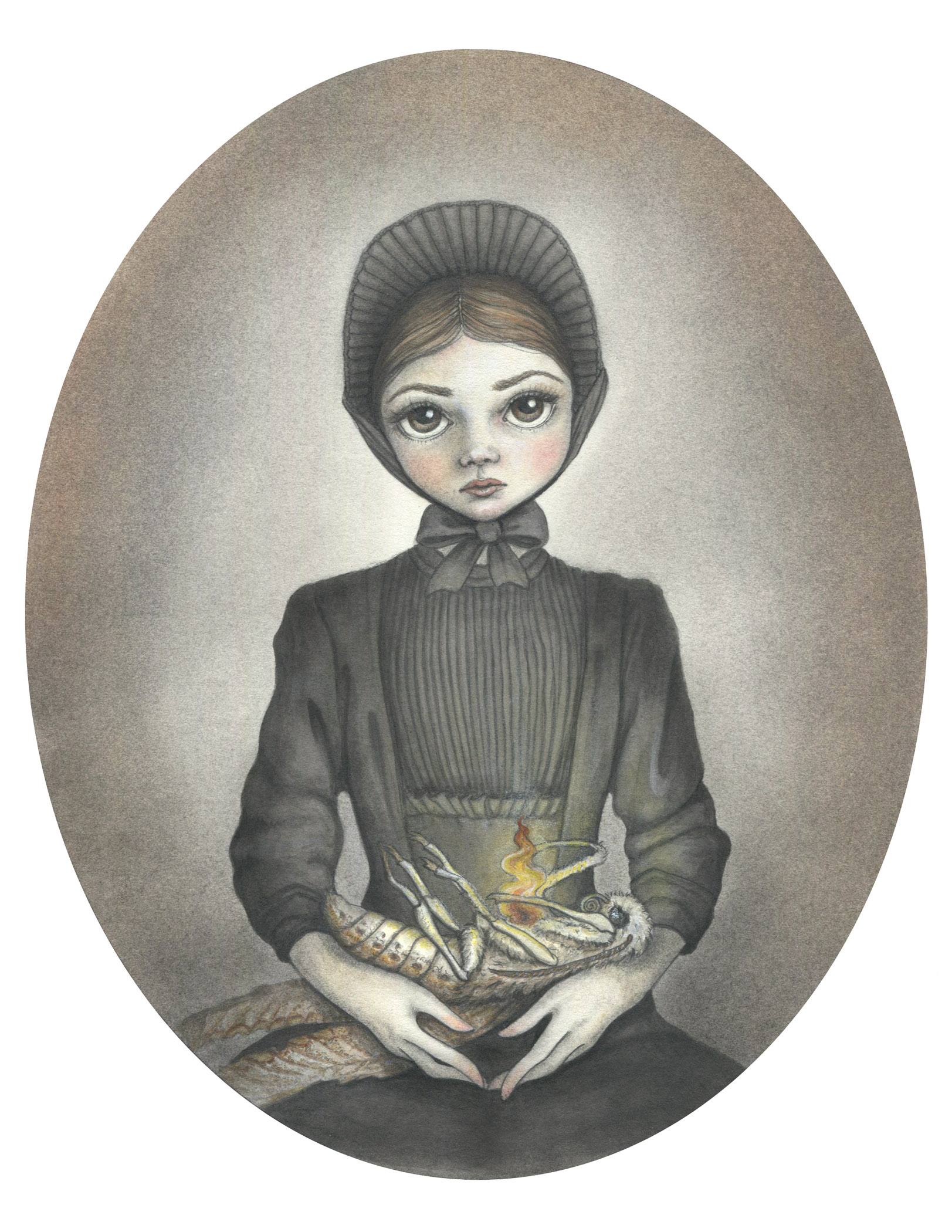 Drawing from the influences of Mark Ryden—an artist Jean reveals her affinity for—Jean initially stimulated her craft by illustrating peculiar portraits of people in a way that pulls from a Medieval style of stark characters sitting in a Rococo-style chair with a stoic expression, leading the eye to gather emotion from the subtle symbolism found with the objects, colors and shapes harmonizing the face. Instead of coming across as it would in a historical context, though, her take is modern, unorthodox and mysterious. As her website states, her first portrait of a girl named Charlie “was in a completely different style than anything I had done before, but I loved her. She brought out something new in me—a way for me to create stylized portraits.” In this month’s cover art, “Dear Deseret,” the girl holds a beehive and a seagull, evoking not only the pioneer settlers that migrated to Utah in the 1800s, but also the elements of crafting from the home. The woman doesn’t look cute or kitschy, but sits straight with confidence, carrying the power that a handmade piece holds.