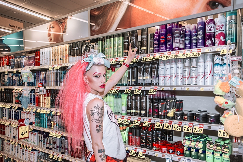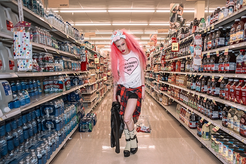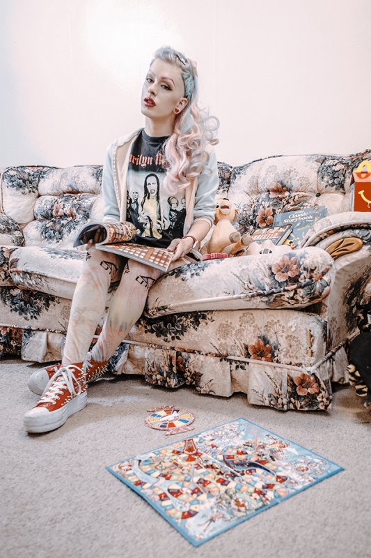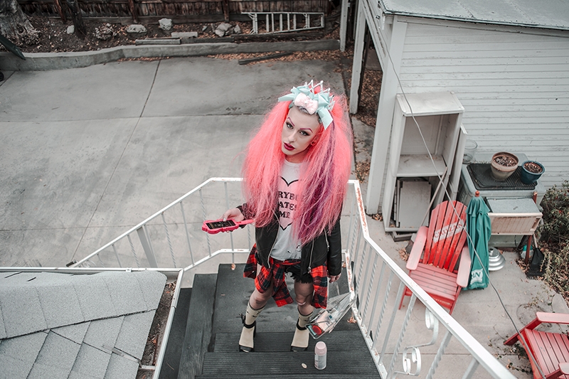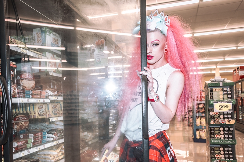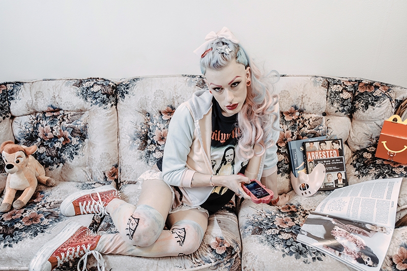 As any ’90s brat might have guessed, Lisa Dank’s ‘drag’ name is a play on Lisa Frank, the beloved school supply queen, whose surreal, kawaii, animal-populated visions are embedded in the contemporary American psyche. The inflection of ‘dank’ reflects the same vision faced with the actual surrealism of contemporary society—Lisa Dank’s image is cute and light, yet subversive and playful. Orien explains it thus: “Lisa Dank is 6 years old. She was born on the Internet—she’s really obnoxious and bratty and always grounded.” Orien’s tattoos—among them: Ren & Stimpy, a slice of pizza, the title of a great Hole song, and his cotton candy aesthetic are a testament to this flippant, devil-may-care attitude. Designers such as Moschino and Jeremy Scott and performers Jeffree Star and Salt Lake’s Drew Landerman comprise some of Dank’s influences.