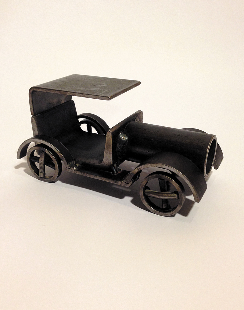 Whiting notes yet another of his favorite pieces in the show, Scarab by artist Hilary Jacobsen. “Not only because I love the painting but also … the effect the trade has had on the man who traded it,” Whiting says. The man traded a toy car welded together by his father. “This object represents all the good and happy times I had growing up and living with my family,” the man says in his statement. “I do find that the piece makes me think about the object. What they represent is rather different, so they are linked in my mind primarily because they were exchanged for each other … While this piece of art has come to represent the future for me, my father’s sculpture of an outdated automobile represents the past …”