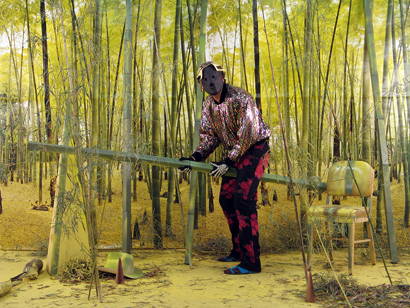 It’s a treat to follow through the evolution of Bress’ practice. In the 2006 “Being Bamboo,” Brian Bress dons a mask, a shiny metallic shirt and skeleton gloves and stands in front of a bamboo forest backdrop, gripping a long piece of wood that has been painted green. (They’re actually IKEA legs, fastened together.) His tone is high-pitched and self-deprecating as he directly addresses the viewer, insisting that this length of bamboo could be anything, and somewhere in the zaniness, there’s a lesson of innovation and possibility—of creativity as a good thing—a theme which, along with Bress’ deliberate breaking of the fourth wall, pervades his later works. In 2010’s “Creative Ideas for Every Season,” Bress brings us on a dreamlike road trip with an Agnes Martin–inspired woman, who deadpans as she verbalizes Martins’ writings and drives a cardboard car through a surreally collaged, purple-toned desert. Bress is refreshingly whimsical with the video: The woman draws a cartoon character in the air, coasts past a suit-wearing bird and has hilarious chats with various characters, some of whom we encounter in Bress’ later works.