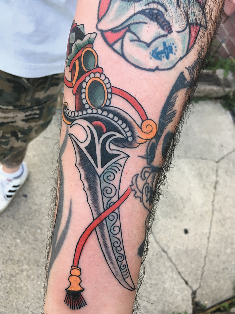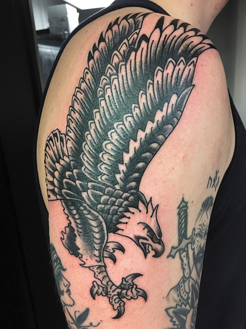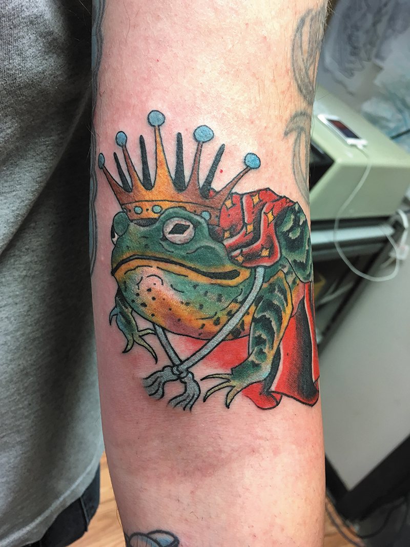 Favorite custom piece you’ve done: Half sleeve on my friend Adam of an infant portraying himself and crawling into a mouth of a hippopotamus—an idea derived from a particular dream he experienced in which a realization took place and detoured him from his familiar road and onto an even greater life journey.