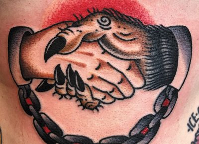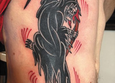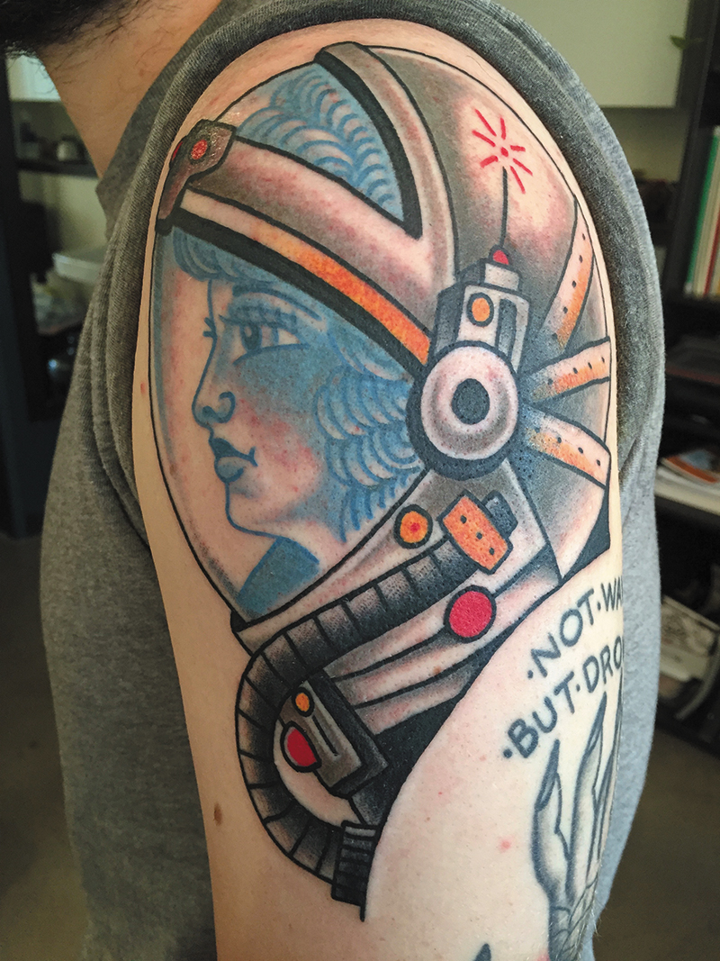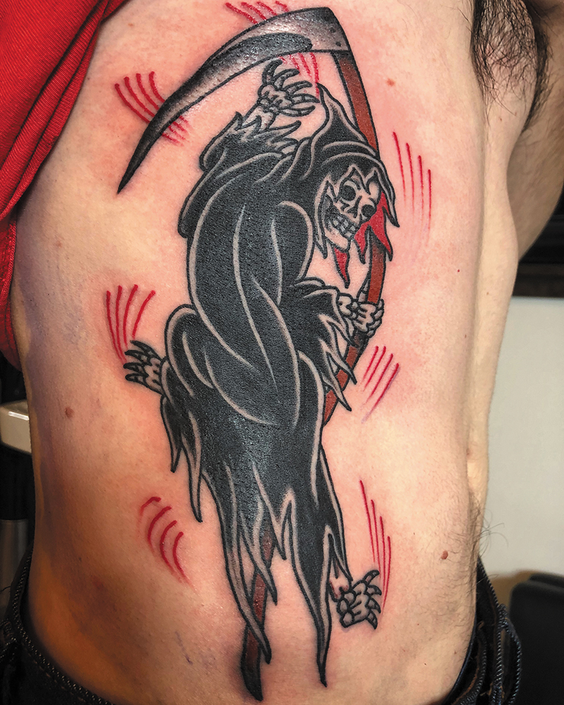 Nerdiest thing you know about tattooing: This isn’t exactly about tattooing, but it’s connected: One thing I’ve kinda geeked out on about tattooing is the fact that people think—and you hear this all the time—they think that tattoos last forever, but they only really last as long as you do! I love the juxtaposition of permanence and temporality in relation to our own existence.