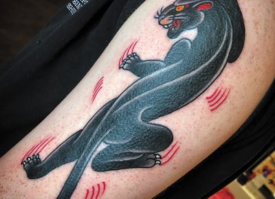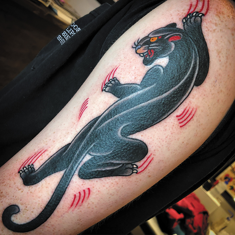 Favorite subject matter: Girl heads/pinups, panthers and reapers. Oh, and hands! I love doing hands holding random objects. Real tattoos that look like tattoos!