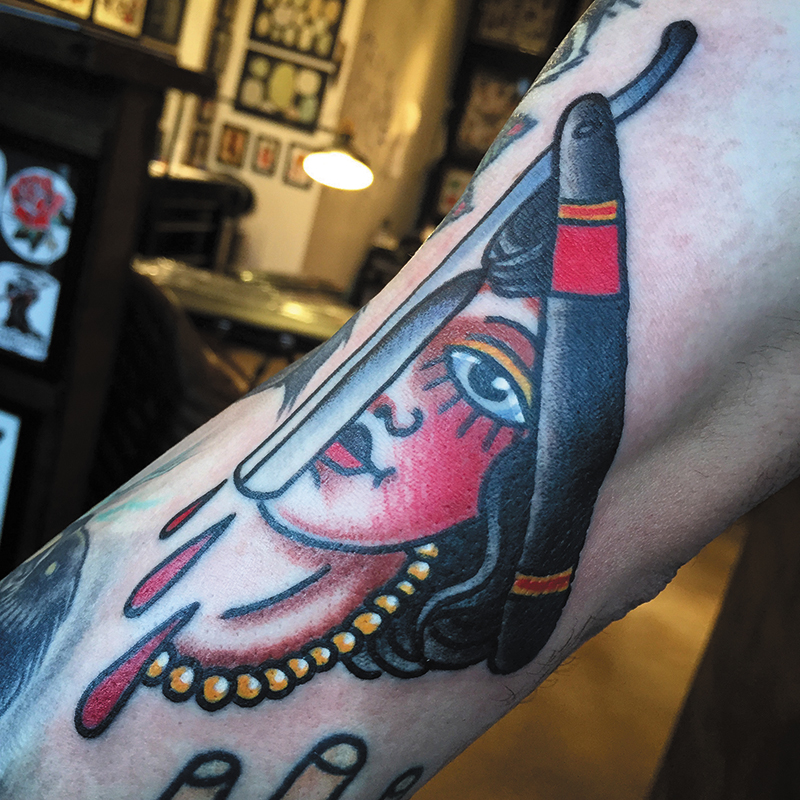 Best tattooing tunes to play in the shop: This is a tricky one. The “go-to’s” would be punk/hardcore, hip-hop/reggae and post-punk. It always differs from day to day. At LHCT, you’ll hear anything from Bauhaus to Iceburn to Chelsea Wolfe to The Oppressed to Dead Prez with a little Morbid Angel and Peter Tosh thrown in every once in a while! I like listening to music that allows me to zone out on the tattoo. If it’s too obnoxious, I can’t get past it. If it makes me feel like we are hanging out at Forever 21—or any mall store, for that matter—then I can’t get into it!