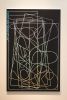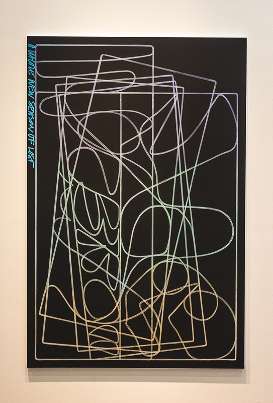 To explore how his painting is a sign, Rayne includes another type of loaded reference: text. In this particular work, Rayne plays with double entendres, writing “A WHOLE NEW SEASON OF LOST” to the side of a series robust squiggles. The meaning of the text and the lines then displace one another in viewers’ minds. In “Redact 035” by Max Presneill, the artist experiments by applying marks of paint and then negating them with further marks. The result is a shaded blue background with a series of bright shapes and squiggles, some more haphazard than others, on top of one another. Presneill uses the paint to experiment and reflect on what it means to have been “redacted,” even extending his process to such wide, contemporary scopes as the relationship of the people of interest to different authorities, government or otherwise.