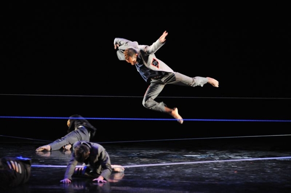 The final piece of the evening was New York choreographer Brook Notary’s G R I D (2009). As if to bring completely home the irony of the title Polychromatic, this piece opened on the third blackened stage in a row, though this time a scrim covered the theater’s bare far wall. The stage, rather than empty, was dissected by a row of bungee cords. Dancers clad in grey business suits fought to negotiate their way through an obstacle course of lines and bodies. The first contact with the ropes revealed them to be coated with white powder which billowed in the air throughout the duration of the piece, and chalked the dancers’ attire.