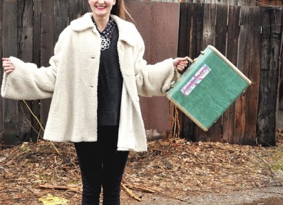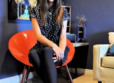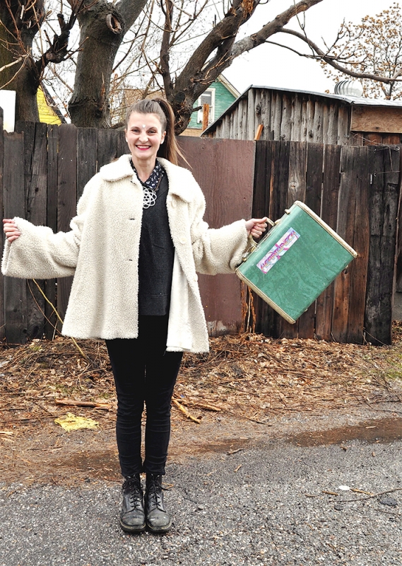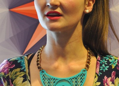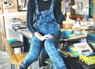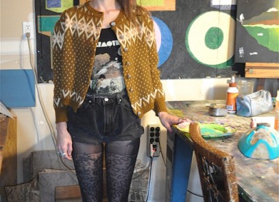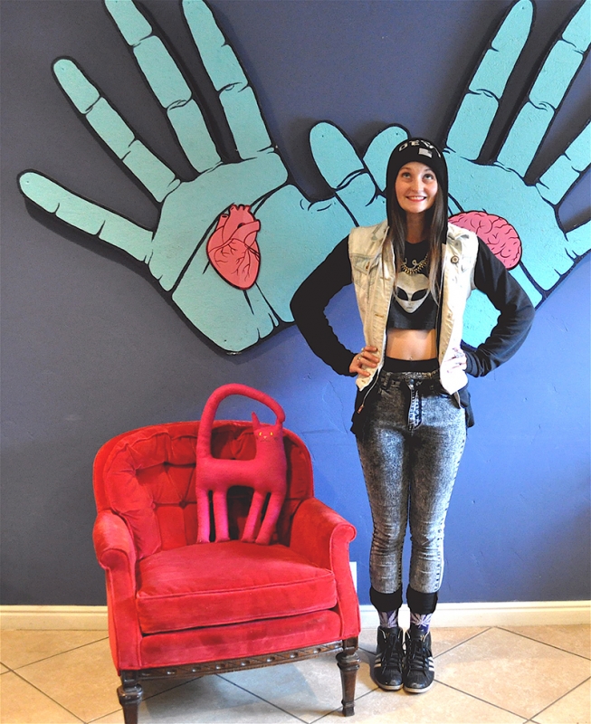 On nights out to Gallery Stroll or SLUG events, Ashley tends to wear black pants or skirts with a feminine top and sweater. She always wears lipstick and admits, “Lately I’ve been obsessed with gluing gems on my forehead!”