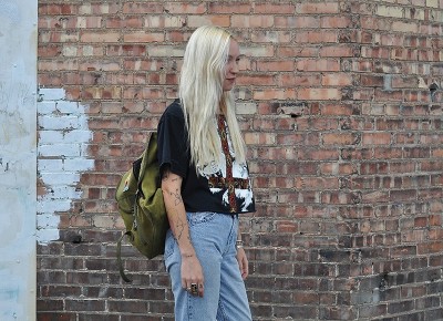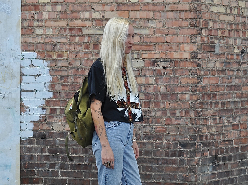 “You know what I think I really like about Salt Lake?” Buetler says. “The people that do get the style that I have and that I give—the people that get it, really get it and they like it.” Having spent a stint in LA a couple years ago, Buetler feels the new-grunge culture is a little washed out there and that people have lost an appreciation for it. Here, she’s wearing a drab green backpack that she “commandeered,” which tops off a grungy look and provides function for both family and personal errands.