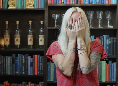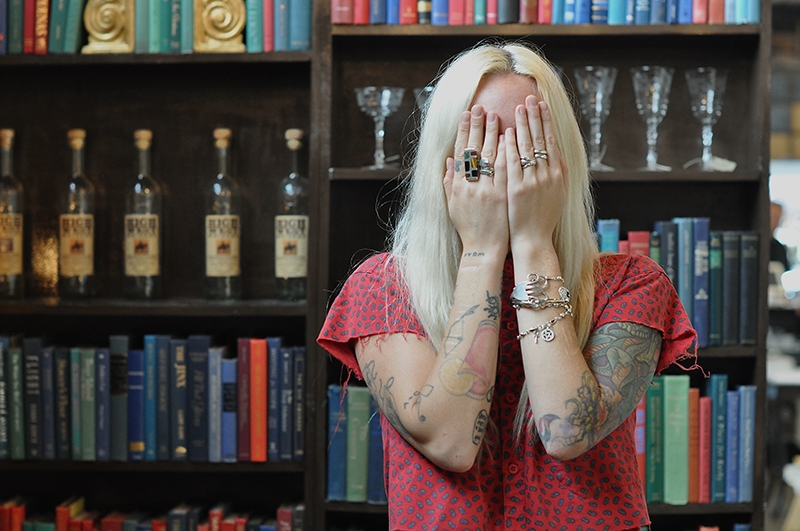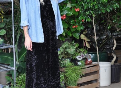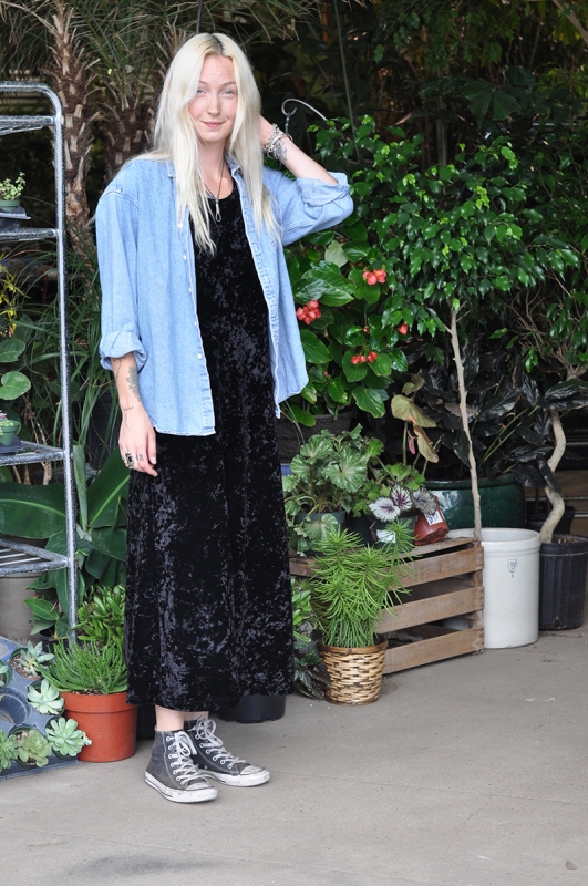“I really like this whole kind of gothic/90s stuff that’s coming around, but I feel like some people really overdo it,” says Buetler. “A pair of shorts could be really cool, but with the hat, the shoes, the choker… they’re just killing it for me.” Buetler prefers to keep her version of ’90s goth simple and elegant. Paired with her go to Cons, an altered vintage dress and a baggy denim shirt, she could be compared to Lydia Deetz on her way to a Nirvana concert.