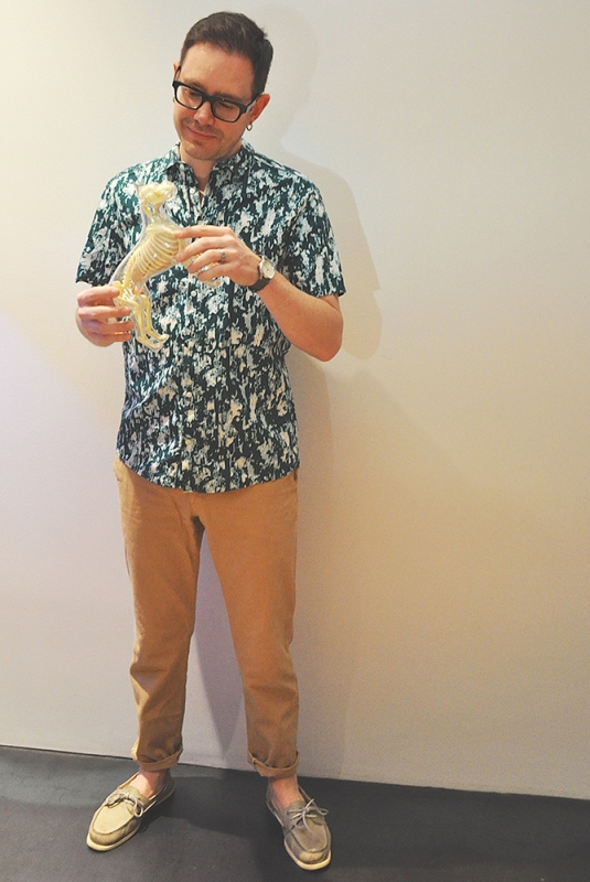 For say, a backyard BBQ in the summer, Jesse adopts what he calls his “bowler chic” look. Going sockless with cuffed chinos and a button down makes for a comfortable outfit, but still gives him the ability to add a surprising splash of color and pattern every once and a while. He says, “I like to have people think they know me and then throw them off.”