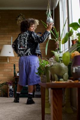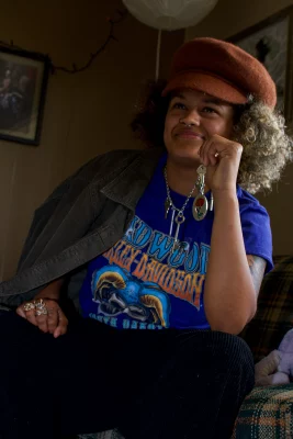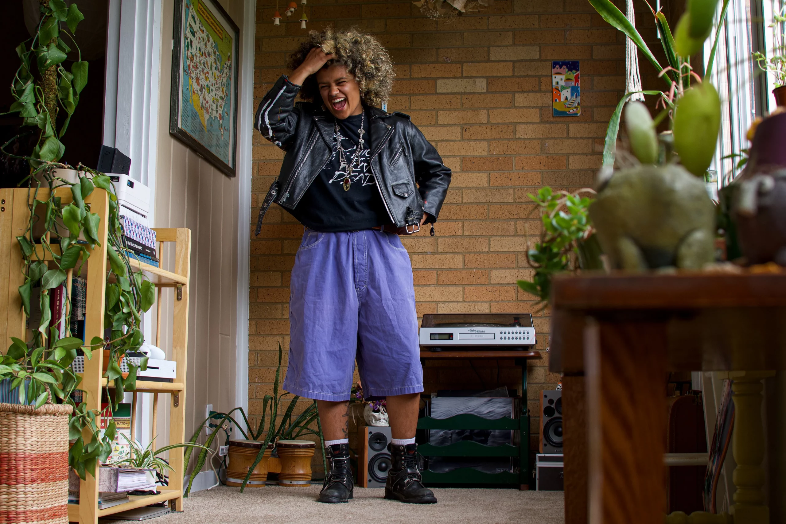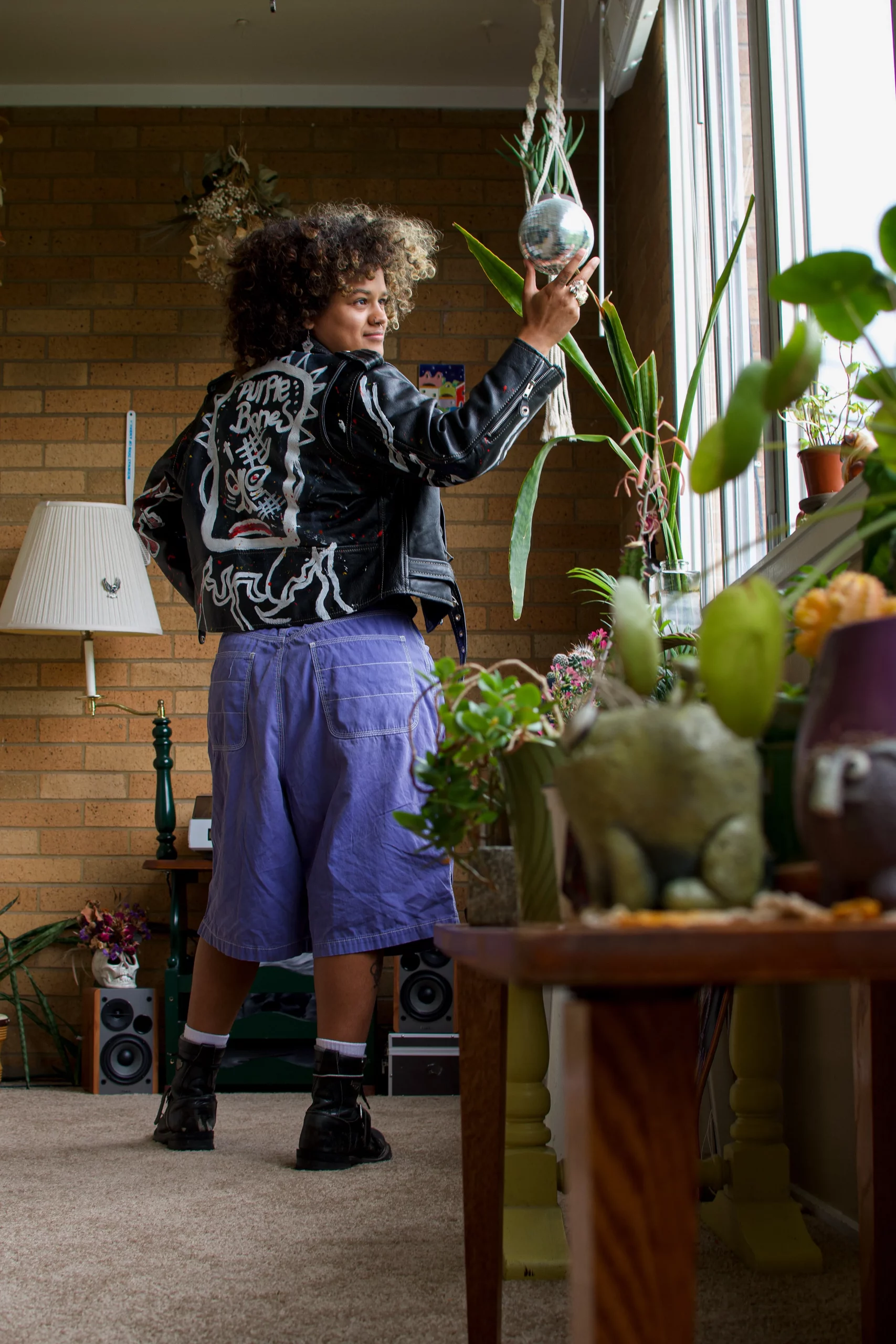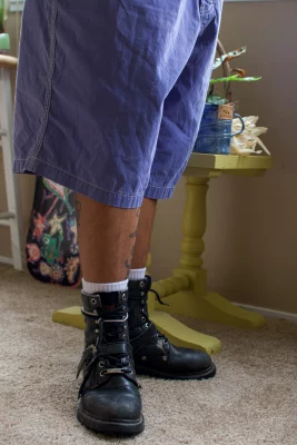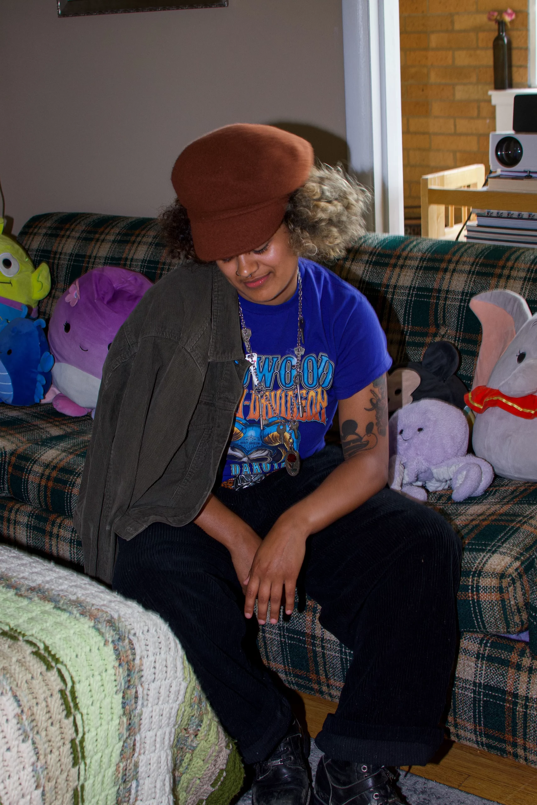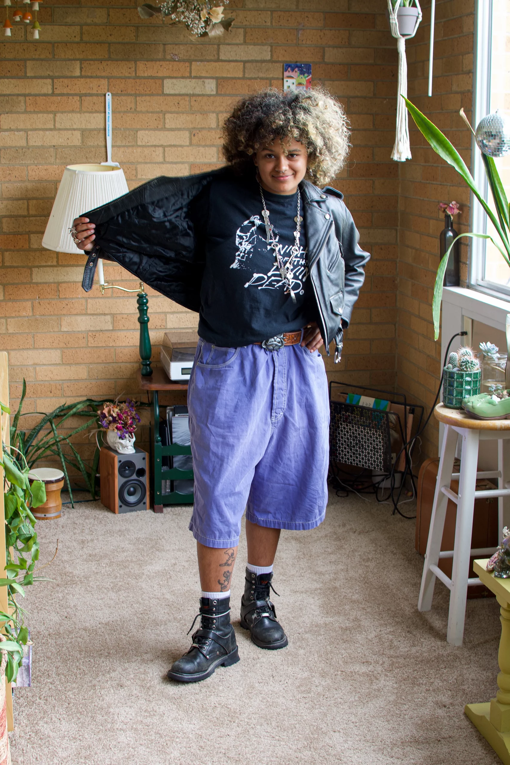 My style is a combination of biker, Western and rockabilly. I pull from a lot of ’80s and ’90s movies. I also love screen-printed graphic tees and my own art.